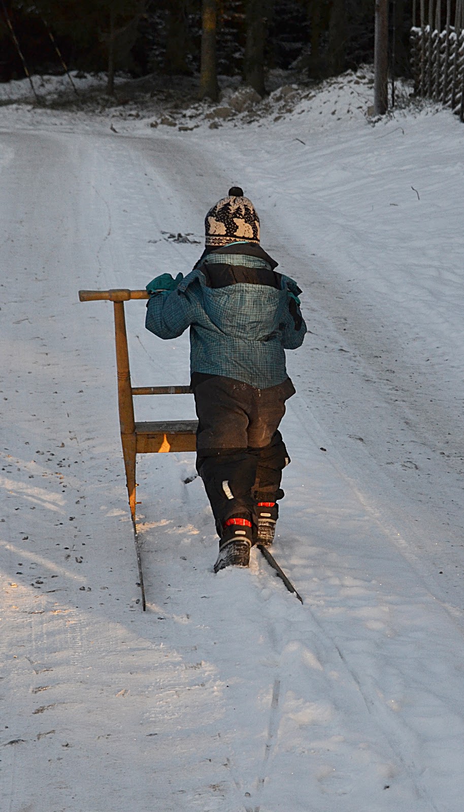 Småtvillingarnas storasyster kommer på besök. Vi ska åka spark, grilla korv och sedan gå in i vår sommarstuga, beläget klivet över diket på baksidan om vårt ordinarie boende. Tände en brasa i den öppna spisen, se in i eldslågorna som hoppar och knastrar och dricka ur våra muggar med varm choklad.